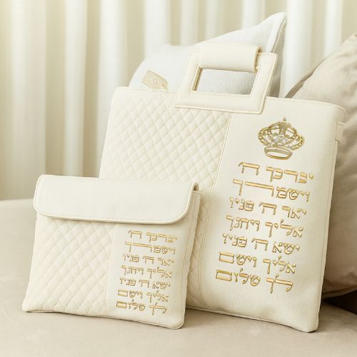 Leatherette Talit & Tefilin Set 38*31 cm – White with Embossed Letters